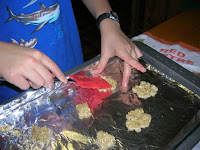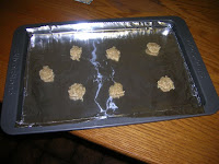 Drop by level measuring teaspoonfuls, about 3 inches apart — they will spread out — on foil-lined cookie sheets.