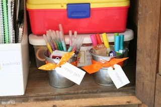 I've tried something similar with glass jars (for smaller items). When we finish with a salsa jar, etc.. (the shorter, wider jars) ~ I clean them and use them to store pencils, colored pencils, markers, etc.. When it's time for homework, I can put all of our jars in the middle of the table for the 4 kids to share. Free, helpful, and fun! Amazing what a little ribbon can do!