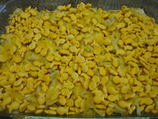 Preheat the oven to 350 degrees. Boil the noodles and drain. Set aside the fishy crackers and some of the cheese for the topping at the end. Stir the rest of the ingredients together.