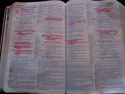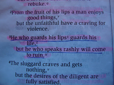 So, I highlighted every single verse on speech in the book of Proverbs with a pink highlighter. You can do this in your Bible with anything you are struggling with or looking to focus in on and learn.