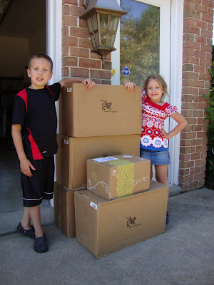 Alex has his finger up marking the start of his 1st grade year. Alexis will be starting Kindergarten. When we pulled into the driveway and saw the boxes, the car was filled with cheering – it felt like Christmas in July!
