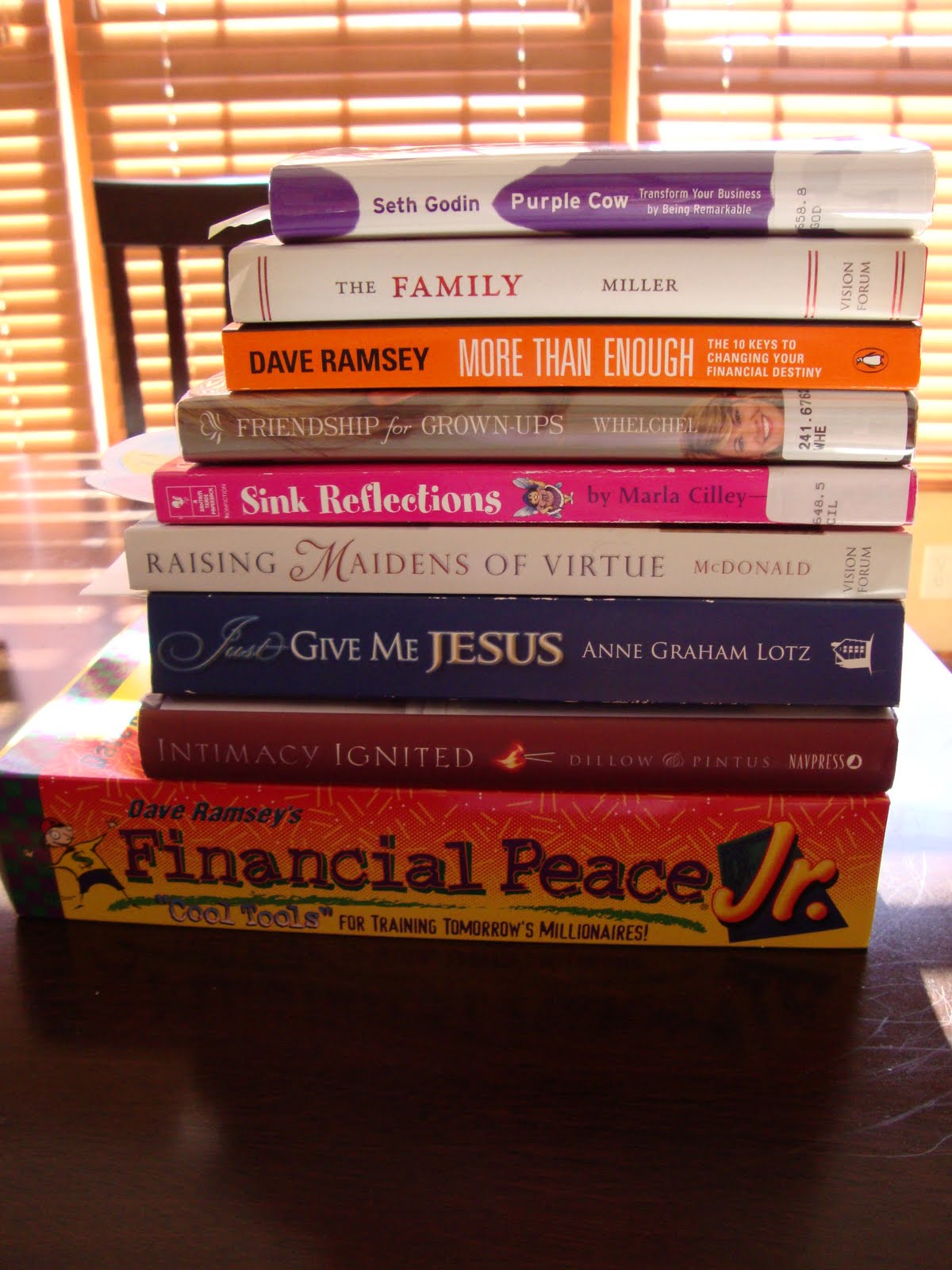 Courtney, I'm a little late to the party but wanted to comment on a few of the books on your list. Anything by Linda Dillow – excellent (you probably know that). I've read everything she's written and am always blessed. I've attended two Dave Ramsey seminars (took our married kids to the second one) and we've been following him for about ten years – wish we'd started earlier but it absolutely made a huge difference in our finances and being able to retire on time. Just read Lisa Whelchel's Friendship for Grownups – good read with some great lines I jotted in my quote book. This was a particular blessing to me as we just recently moved across the country, so we're starting all over making connections and I want to choose well, and be the good friend someone else is praying for. Same Kind of Different as Me is next on my nightstand and I've heard excellent things about it – happy reading!