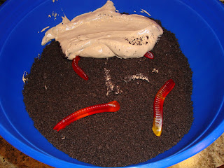 5. Chill overnight. (or 4 hours) Add silk flowers and worms on top and serve!