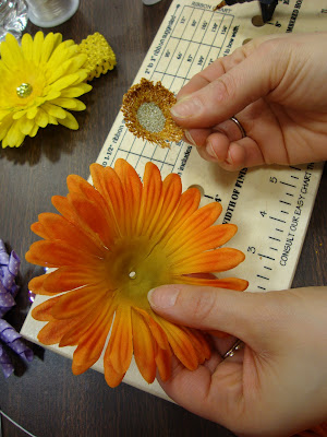 She hot glue gunned shiny rhinestones to each one and then glued the flower to the headband.