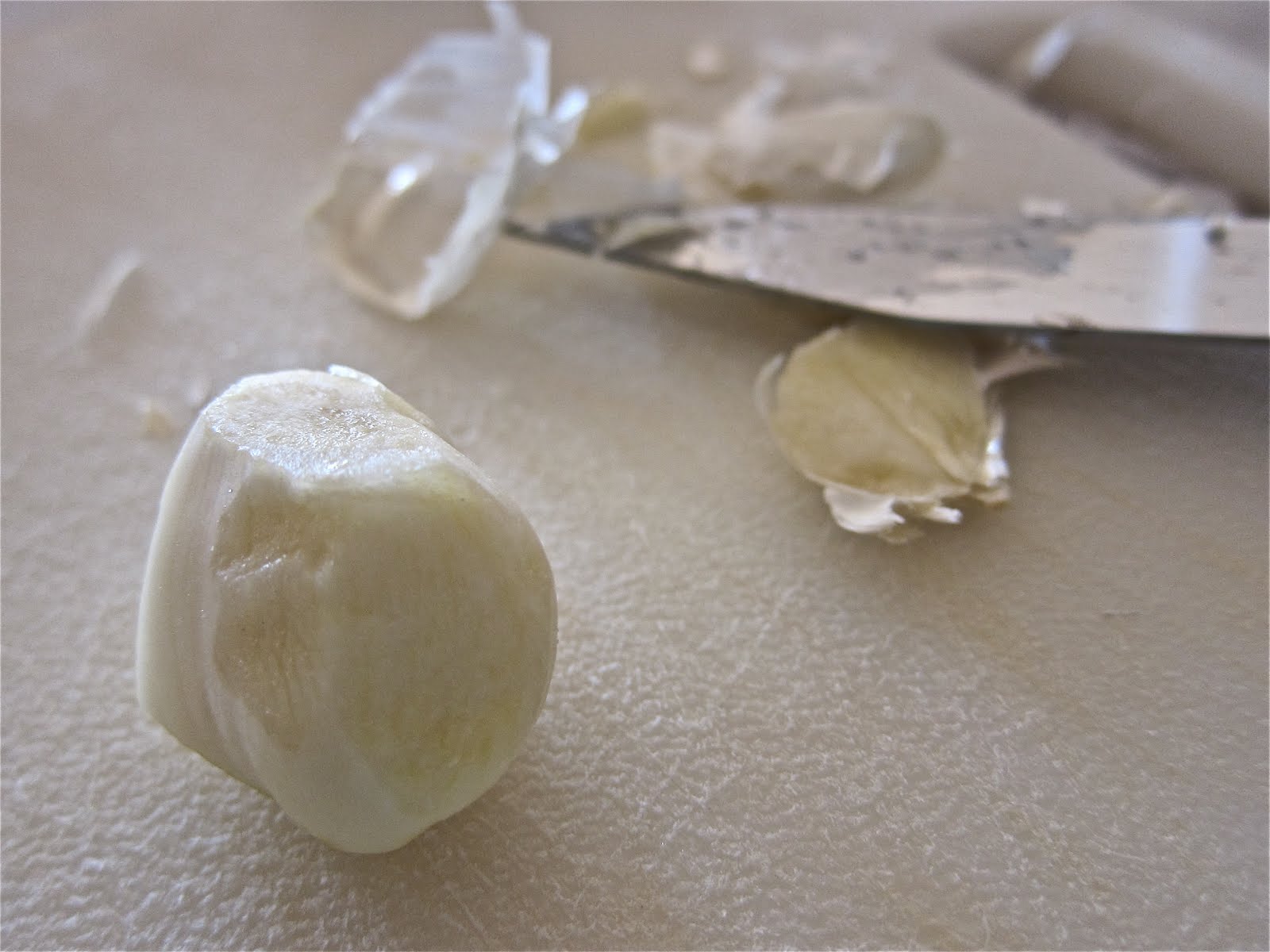 This is what one garlic clove looks like taken off of the head. I cut the tips off of the garlic clove and peel. Then I simply chop it up with a knife.