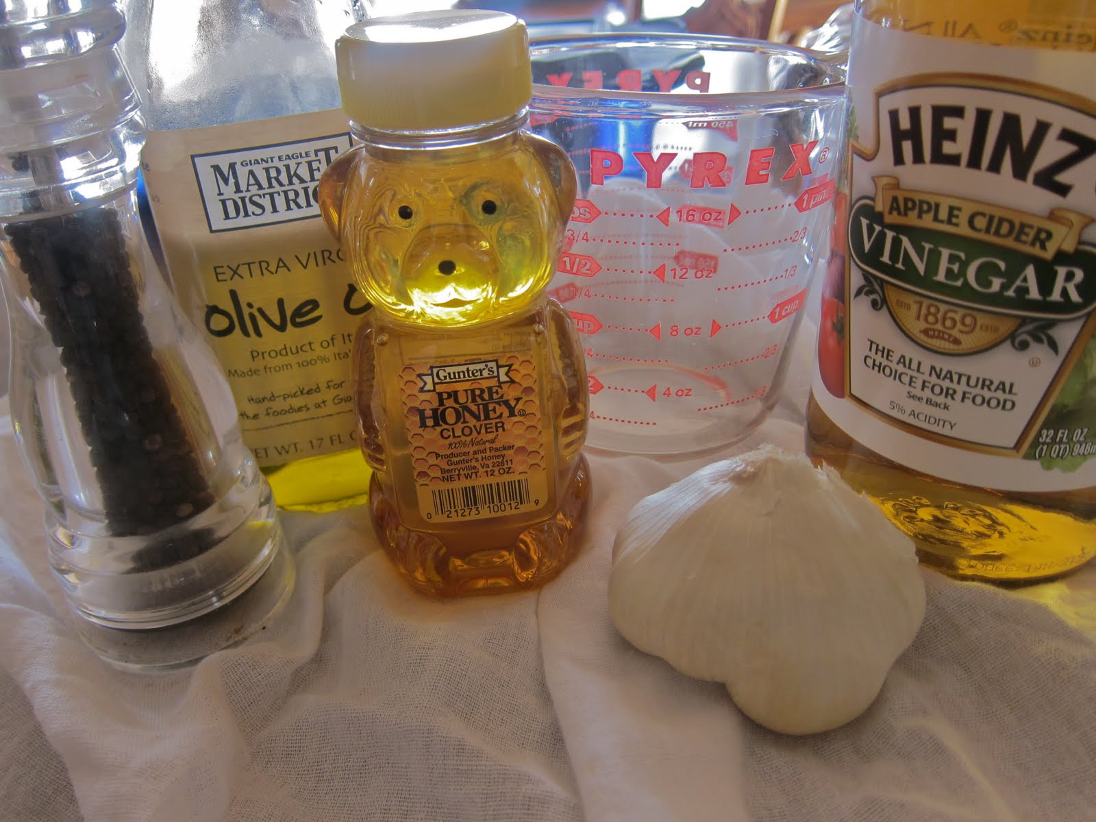 The Dressing Ingredients: Apple Cider Vinegar, Honey, Olive Oil, Garlic, Salt and Fresh Ground Pepper