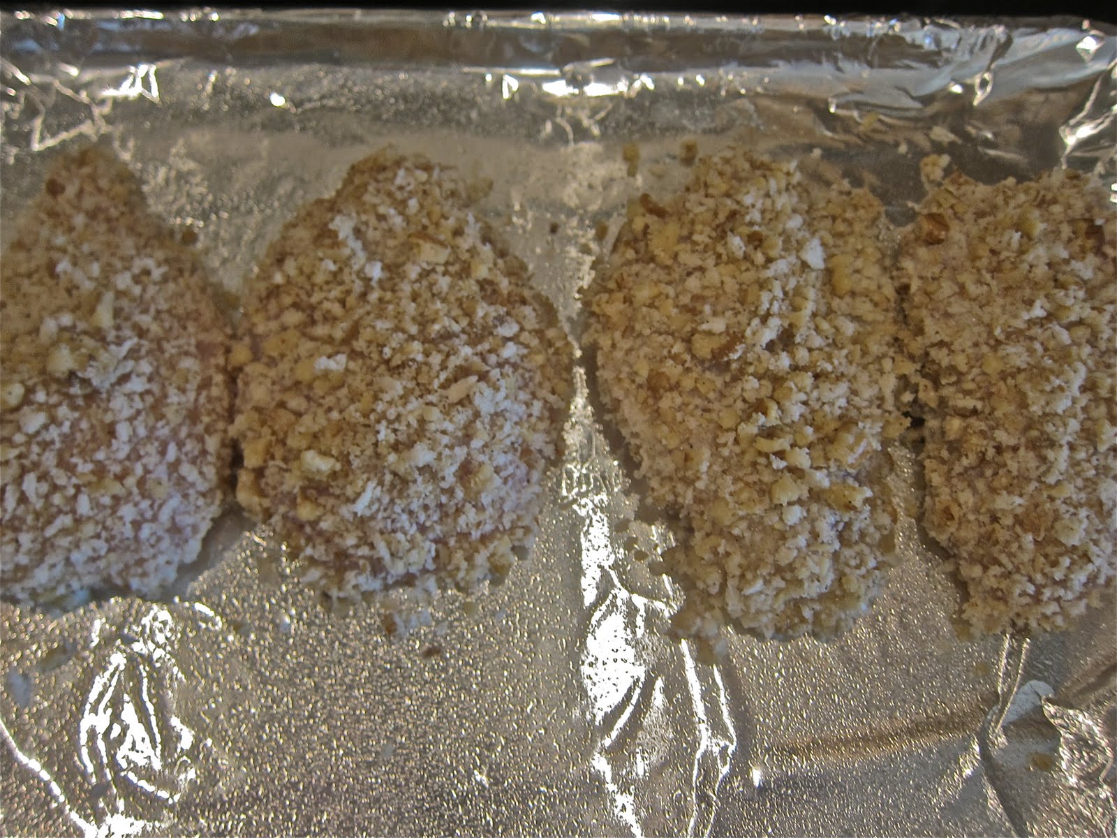 The making of walnut/panko crusted chicken: 4 skinless, boneless chicken breasts, walnuts, egg whites, panko, olive oil Pam, salt and pepper.