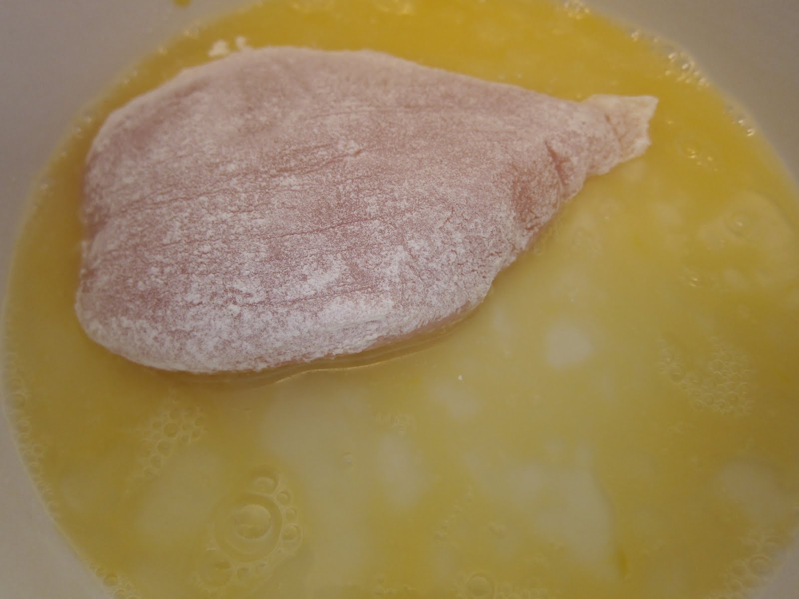 Then dip chicken on both sides with egg whites (if you do not dredge your chicken this will be the first step).