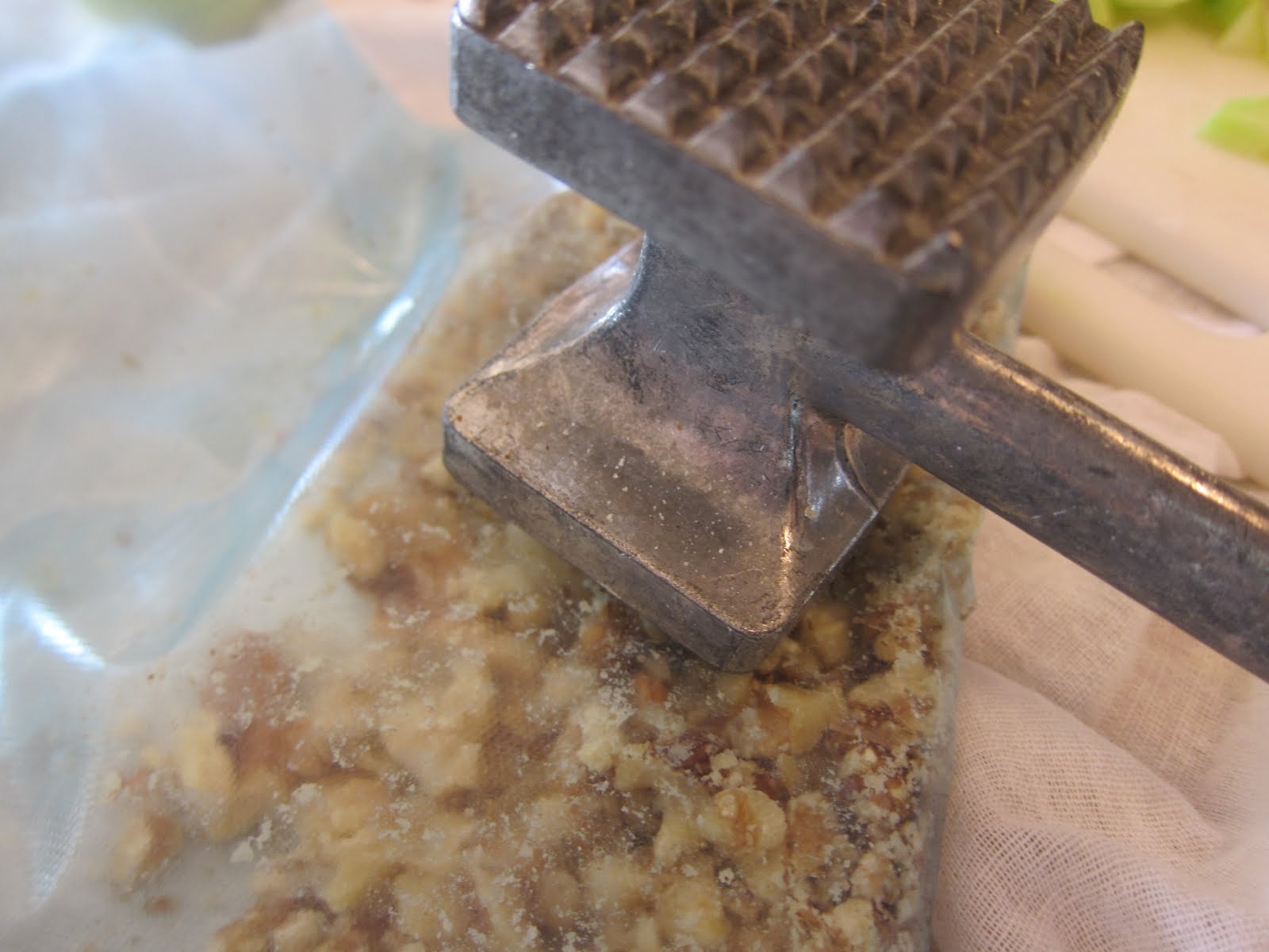 Pound 1 cup of walnuts to a refined state. I place my walnuts in a strong ziploc bag and use a metal mallet- you can also use a food processor for the same desired consistency.