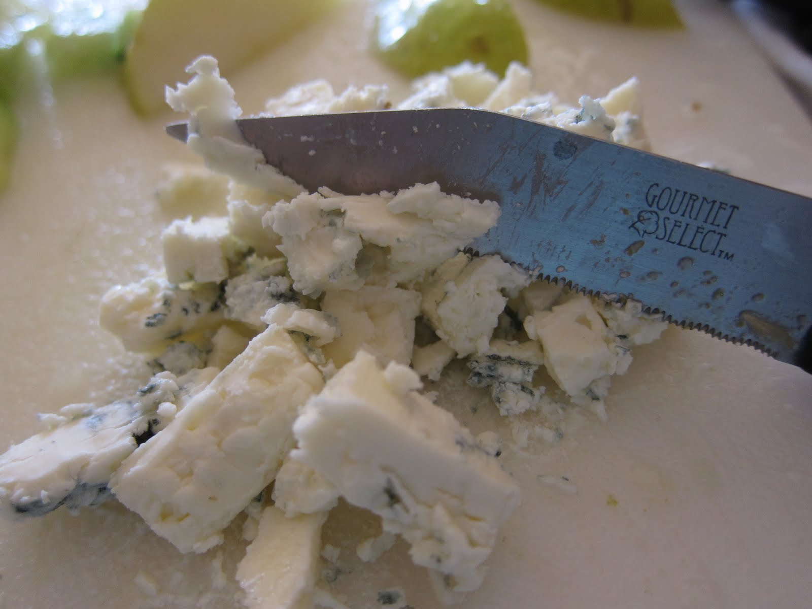 “Crumble” your blue cheese by cutting it with a sharp knife. You also may buy pre-crumbled. Where I live, cheese comes in bulk..haha.