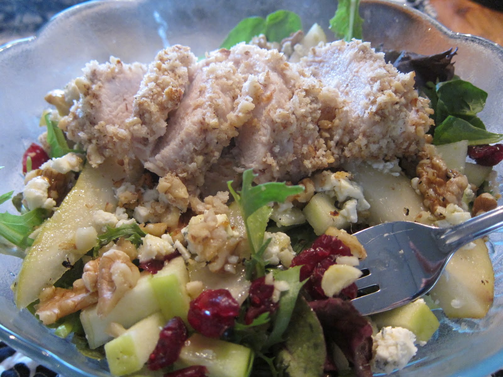 In 3 bowls- bowl #1 add 1 cup flour, bowl #2 add 2 whisked egg whites, bowl #3 add a mixture of 1 cup Panko ,1 cup pounded walnuts, salt and pepper. Dredge each chicken breast in this bowl order. Place dredged chicken on prepared (foil lined and pammed) sheet pan. Spray chicken with Pam and bake for 30 mins or until juices run clear. Slice and place on top of salad and drizzle with dressing.