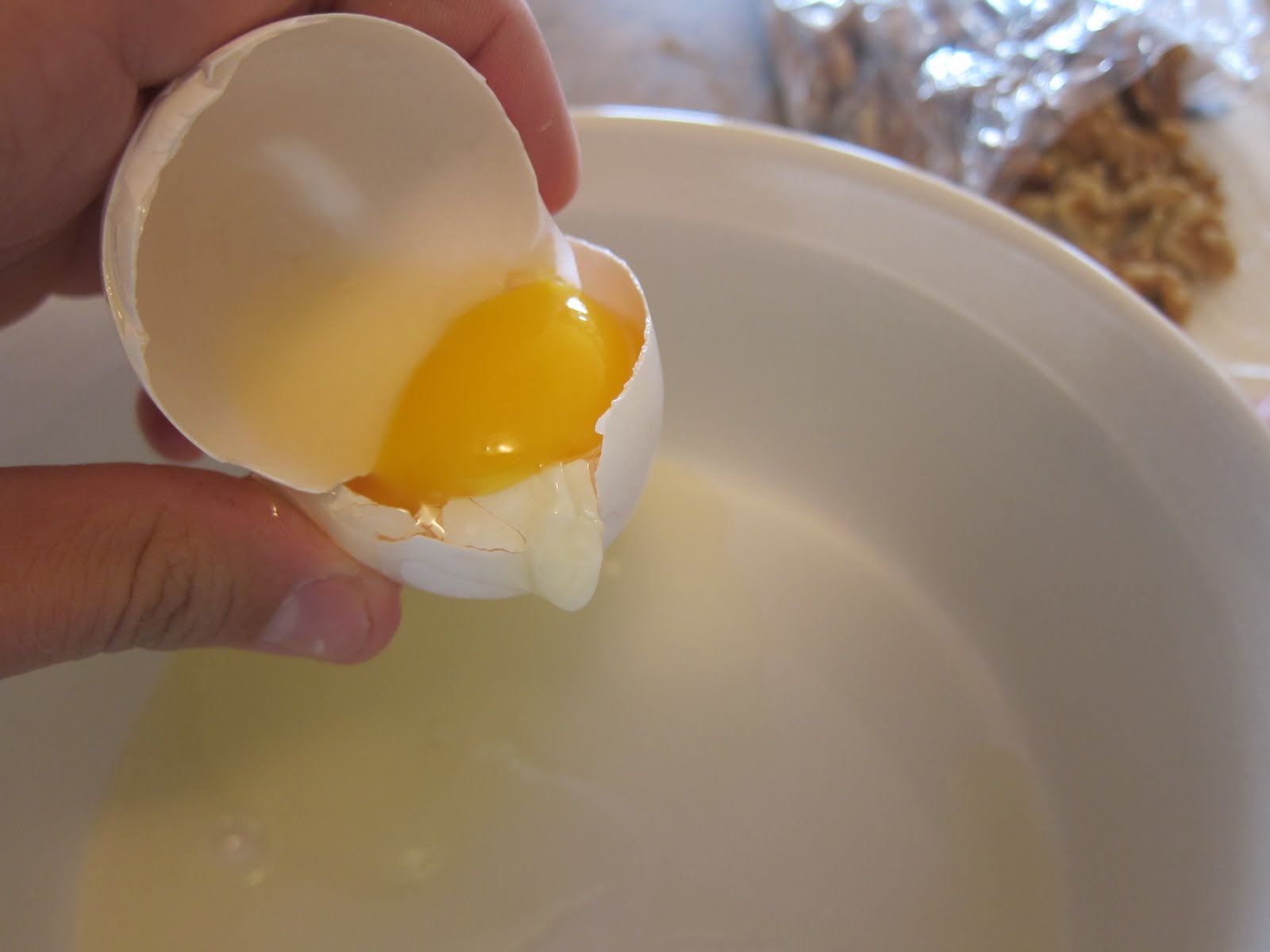 In a separate bowl add 2 egg whites. I crack my egg and toss the yolk back and forth into the 2 egg shells, the whites fall into the bowl and the yolk is preserved in the shells.