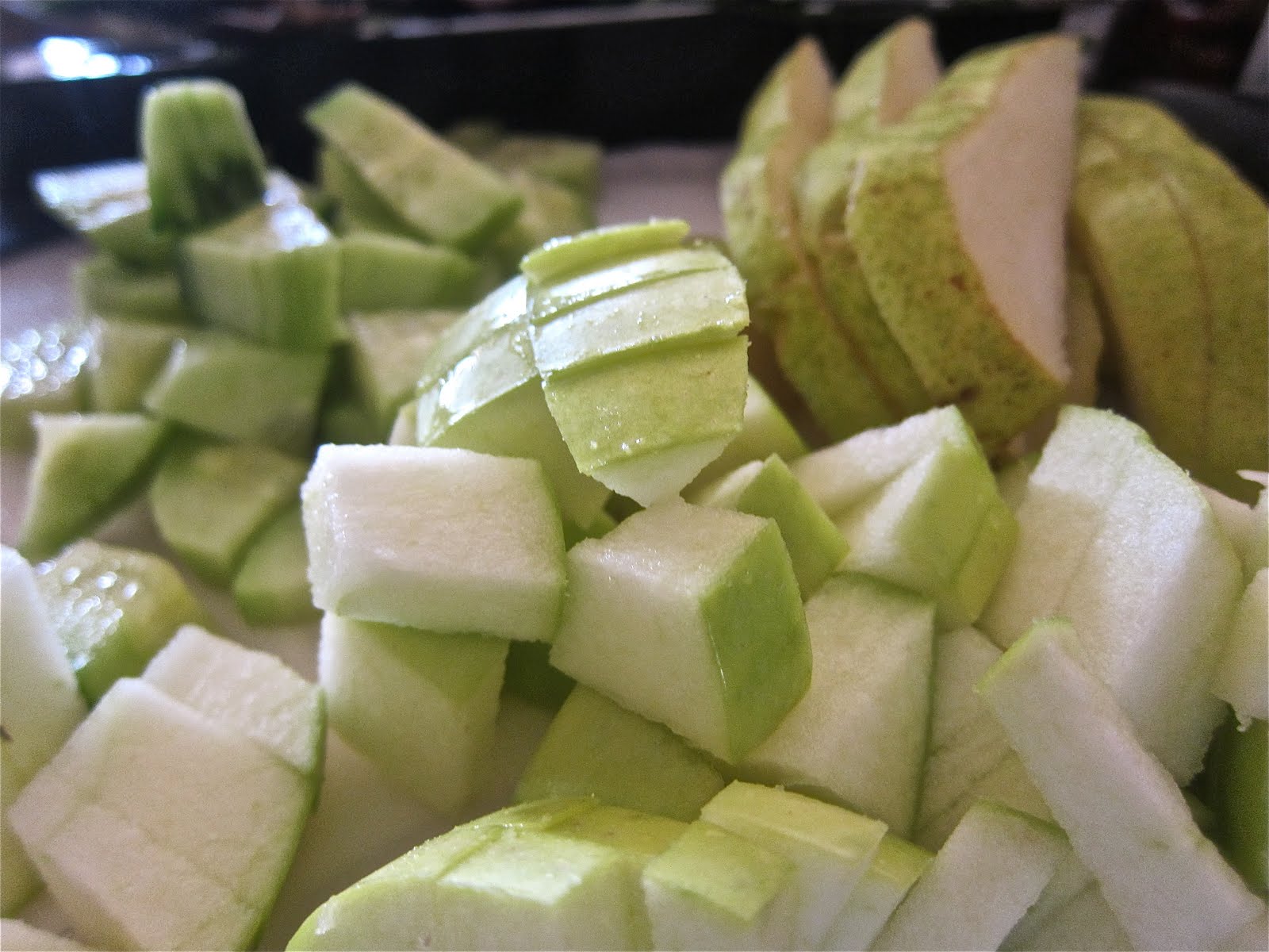Cut your cucumbers, apples, and pears in desired shapes. I like to cut apples and cucumbers in small squares and my pears lengthwise purely for aesthetics.