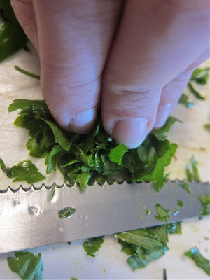 Gather Sage and Parsley in a bunch and chop with knife, keep gathering and chopping until pieces are small (if you have never chopped fresh herbs, it may seem awkward, but it really is that simple)