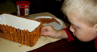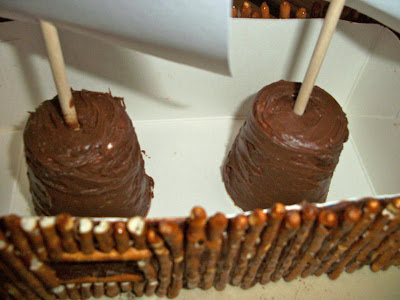 * Lather it with chocolate frosting, and then cover with pretzel sticks.