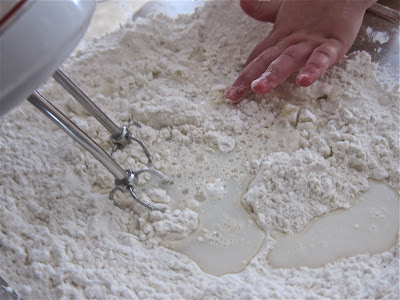 Combine the dry ingredients (flour, baking powder, soda, and salt) and pour into the wet ingredients, then add vanilla and milk.