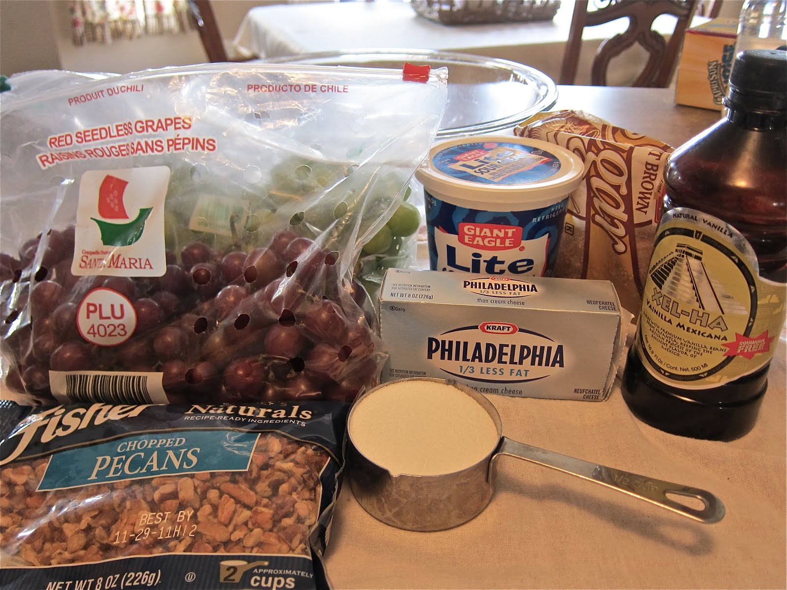 Red and Green Seedless Grapes, Low-Fat Cream Cheese, Lite Sour Cream, Sugar, Brown Sugar, Vanilla, Chopped Pecans