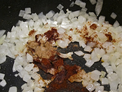 Saute onions and garlic in olive oil on med-high heat. When onions start to soften, add chili powder and cumin