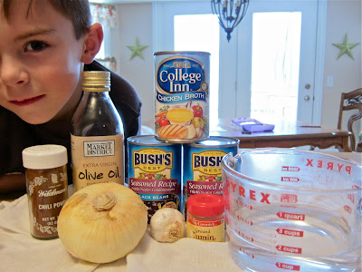 2 cans seasoned black beans, chicken broth, olive oil, onion, garlic, chili powder, cumin, water (little boy optional lol!)