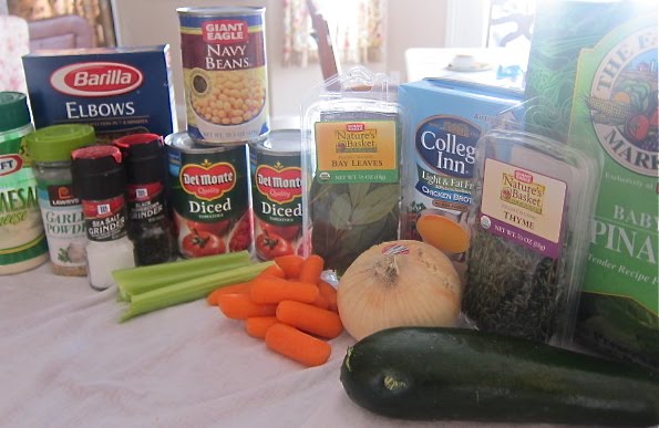 Spinach, zucchini, onion, carrots, celery, bay leaves, chicken broth, thyme, diced tomatoes, navy beans, macaroni, garlic powder, Parmesan cheese, salt and pepper
