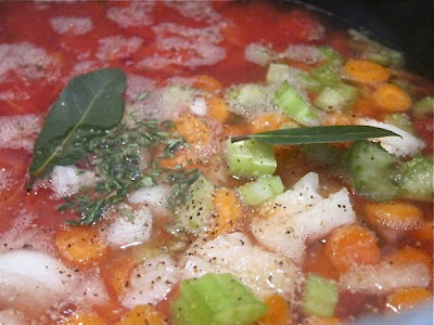 Add bay leaves, thyme, onion, carrots, celery, salt, pepper, garlic powder.