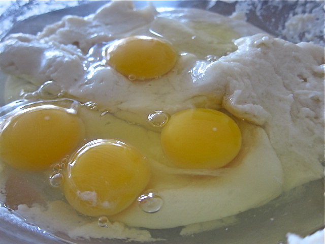 Add eggs and beat well. Bake in an UNGREASED 9x 13 pan set to 400 for appx 30 mins or until lightly browned and “puffy”