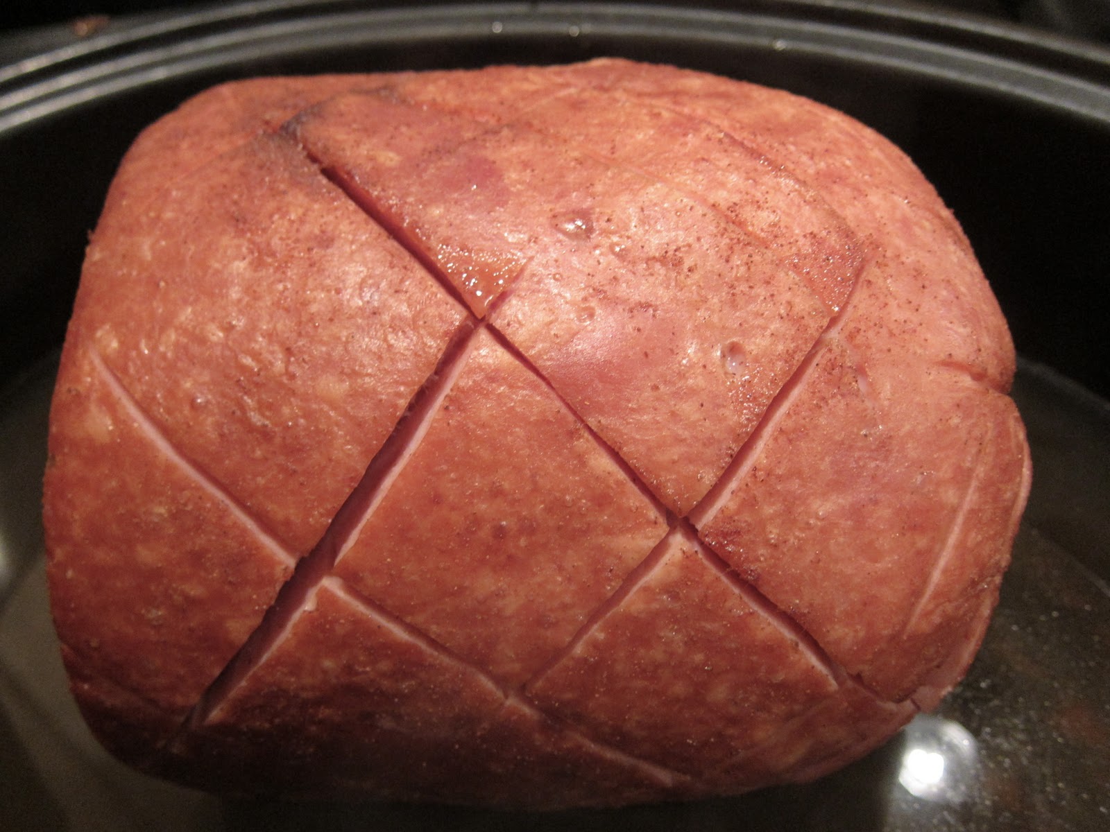 | Start off by slicing the ham 1/4″ through diagonally one way and diagonally the other way to create a diamond pattern. |