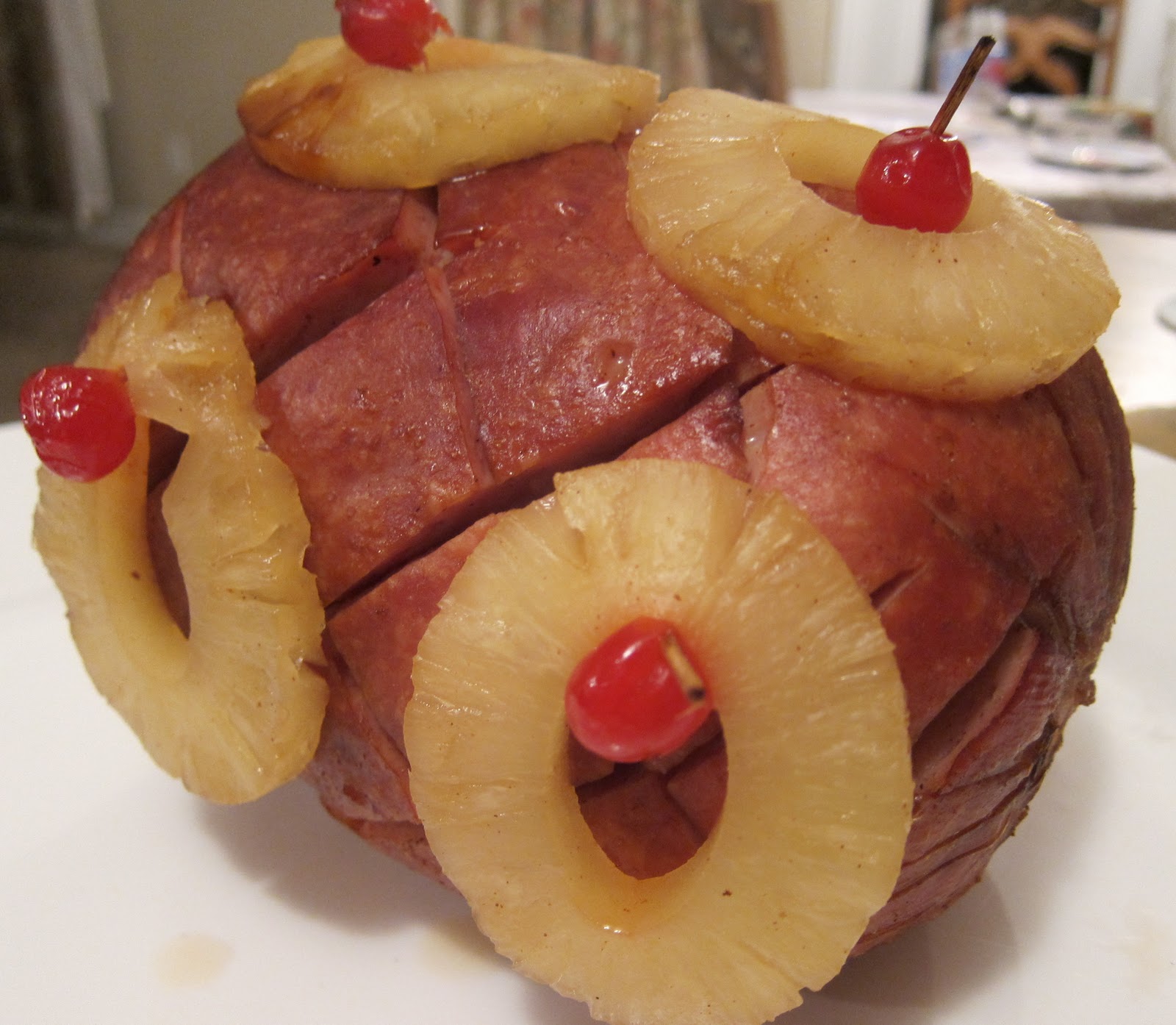 | Ready to be carved. Take off the pineapple and cherries and set aside on your serving dish (they are a great accompaniment). |
