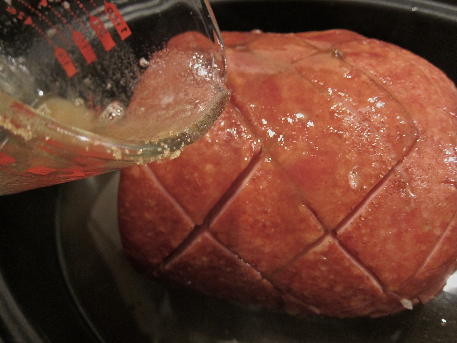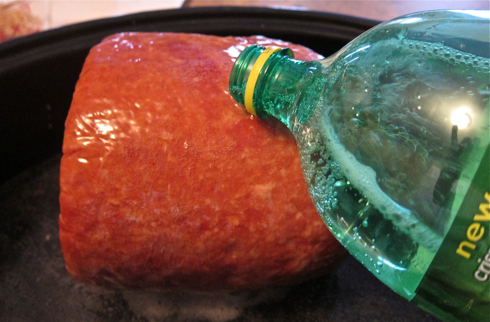 | Place ham in a roasting pan and pour 1 liter of lemon-lime soda over top (this is a trick I learned that mellows the naturally salty flavor of the ham) |