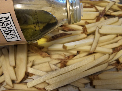To cut down on the oil, I put one Tablespoon or two of olive oil in a large tupperware bowl with a tight lid and shake the fries until lightly coated with oil.