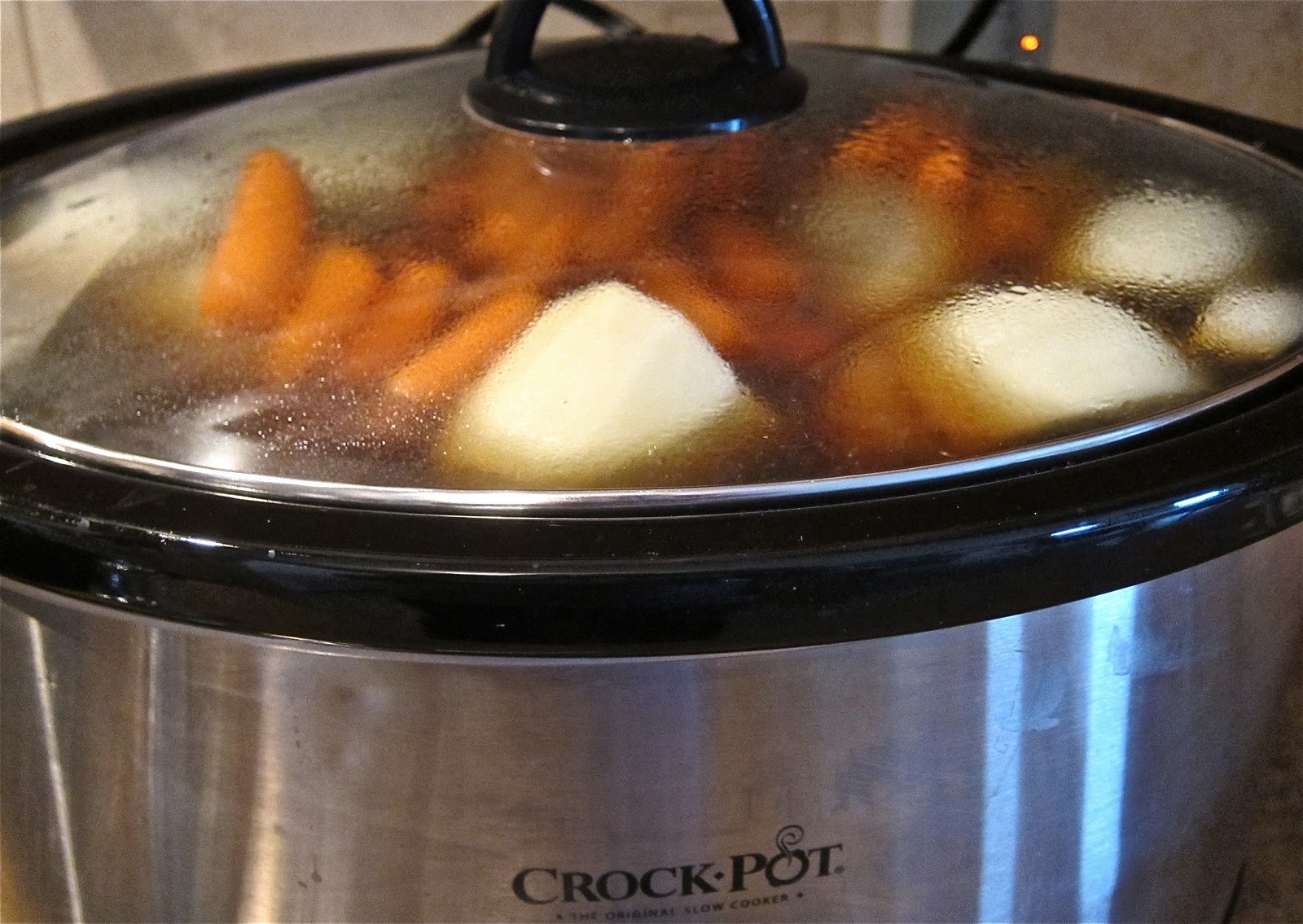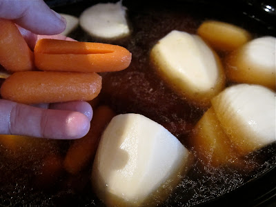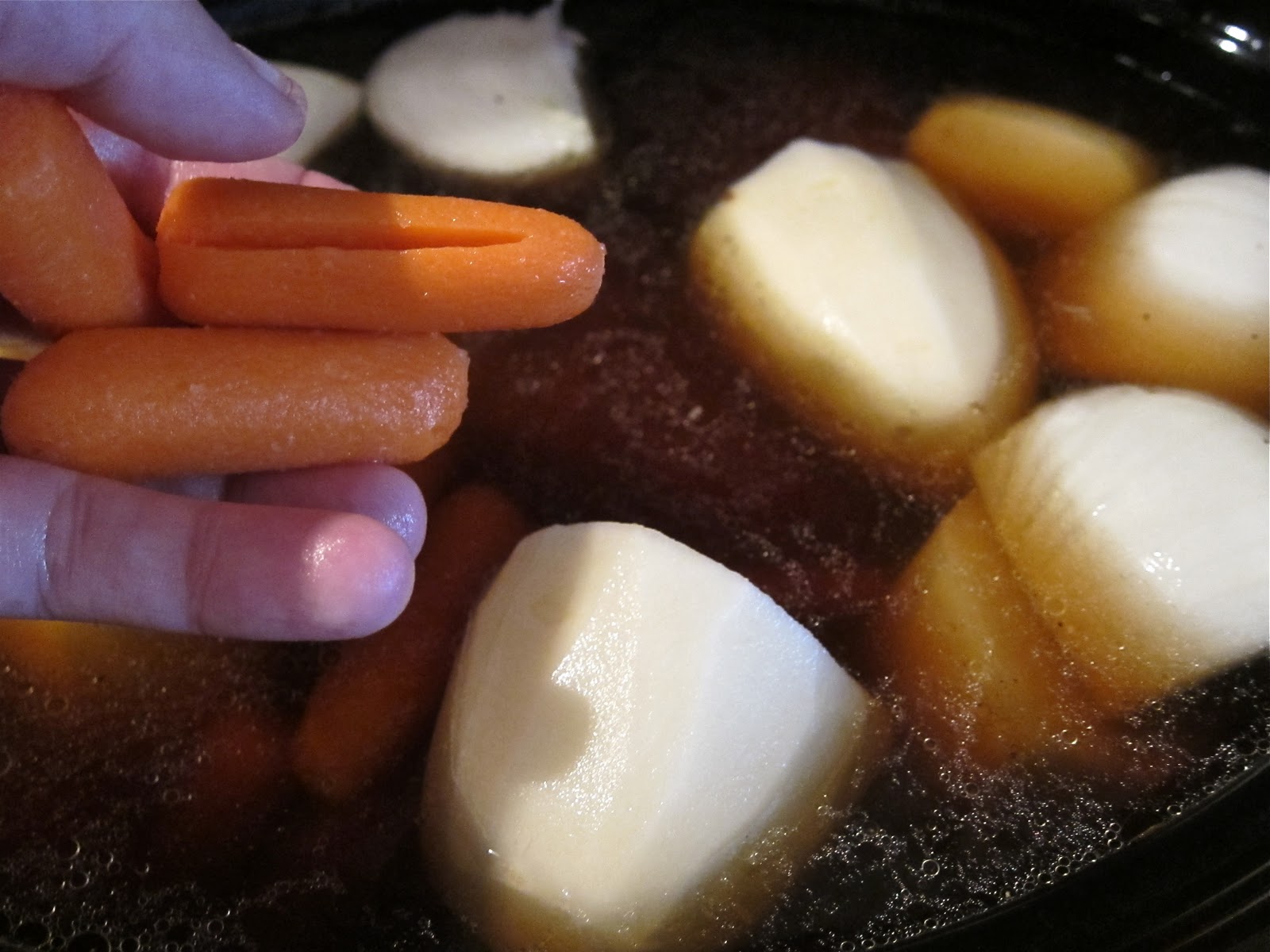 | Prepare your veggies… I have here potatoes cut in halves, onions cut in quarters and baby carrots. |