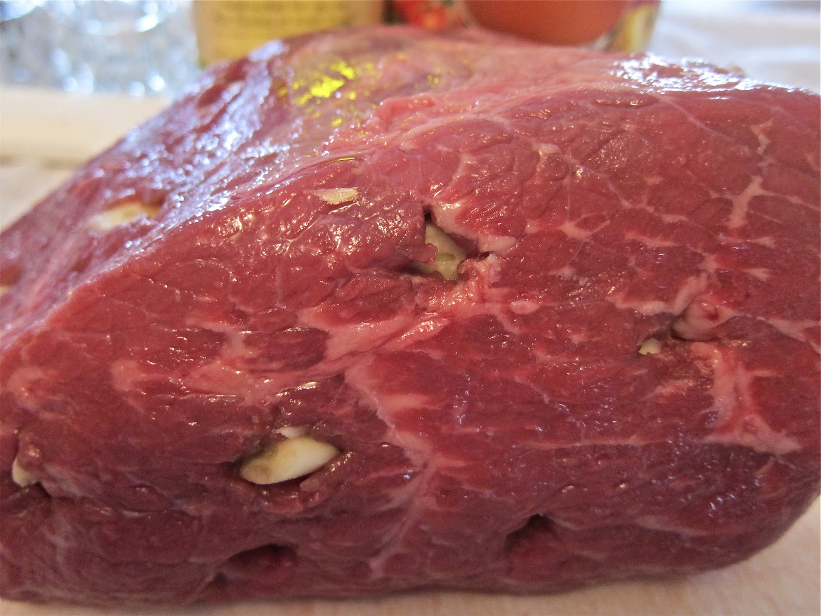 | Fill the holes in the meat with the quarters of garlic on all sides. |