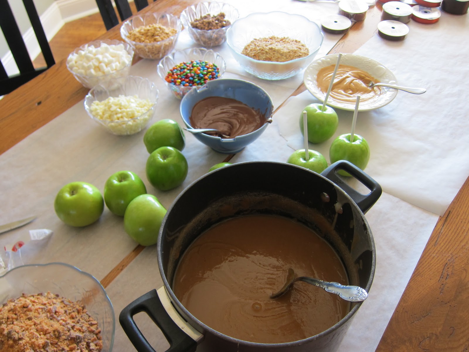 Here is the fun part…set up your “apple dressing buffet” We had nuts, crushed Butterfinger, white choc chips, mini M&Ms, melted chocolates, Heath, and marshmallows. (I would suggest to pick no more than 3 to start off with)