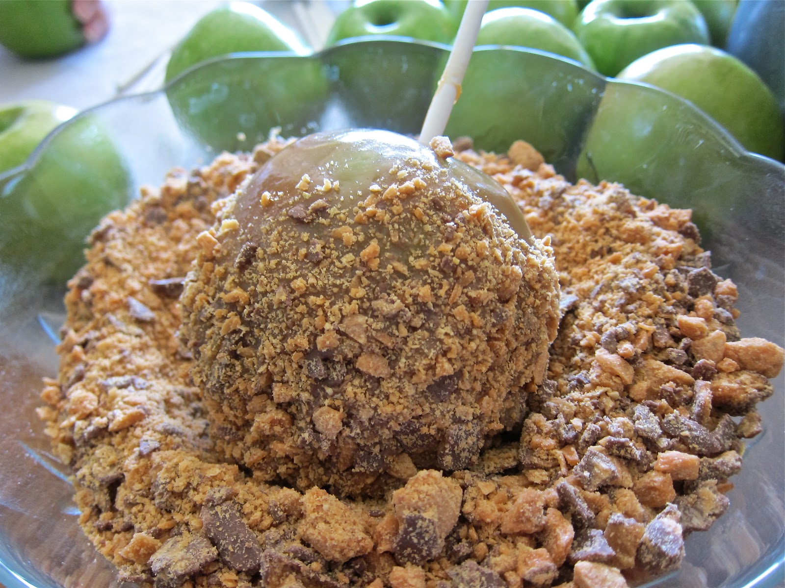After the caramel cools for about 5 mins….stick your apple at the top end and start dipping and rolling in your toppings….(This is Butterfinger)