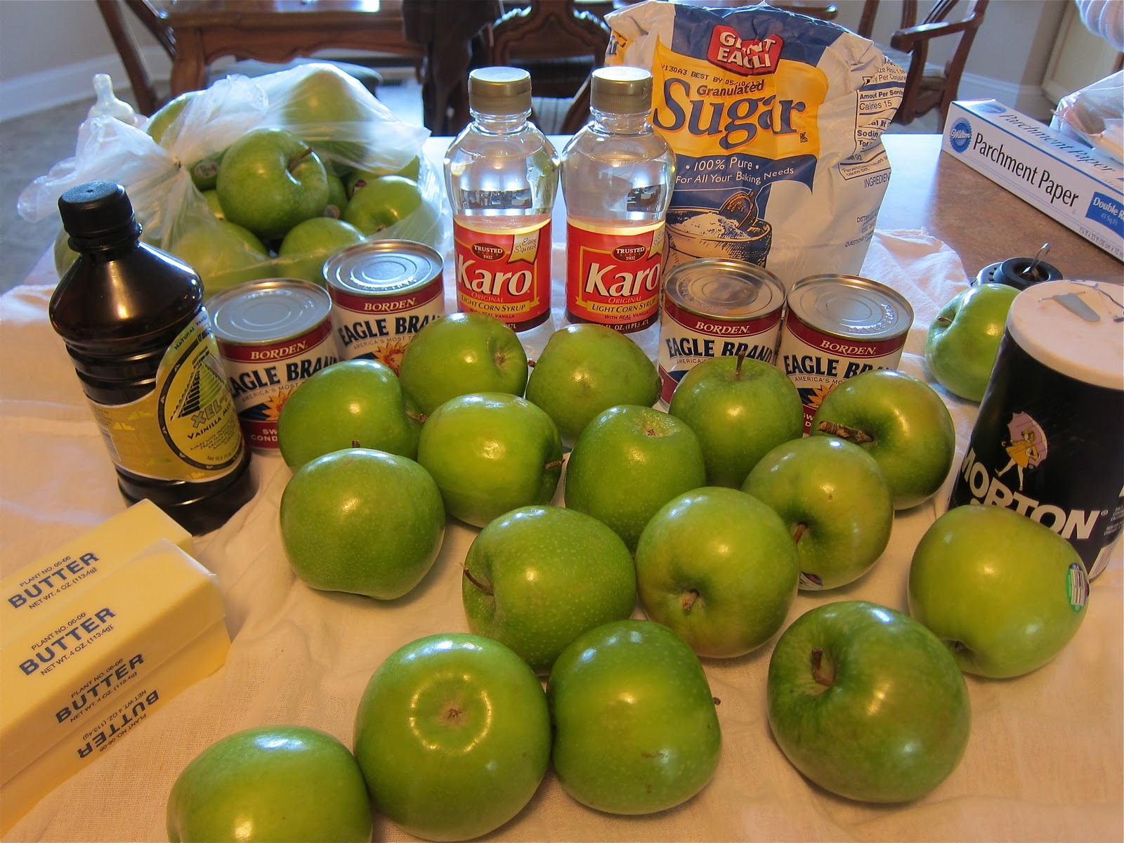 | Granny Smith Apples, Sugar, White Corn Syrup, Sweetened and Condensed Milk, Salt, Butter, Vanilla, Parchment paper (Skewers- I purchased nice ones at Jo-Ann Fabrics) |