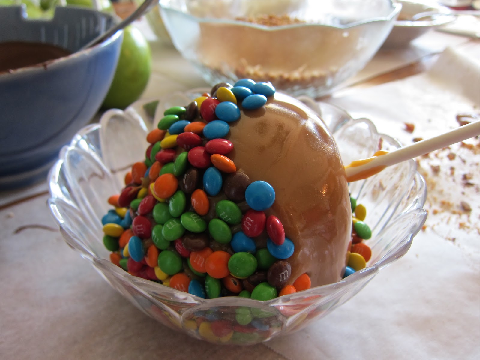 | Here is the fun part…set up your “apple dressing buffet” We had nuts, crushed Butterfinger, white choc chips, mini M&Ms, melted chocolates, Heath, and marshmallows. (I would suggest to pick no more than 3 to start off with) |