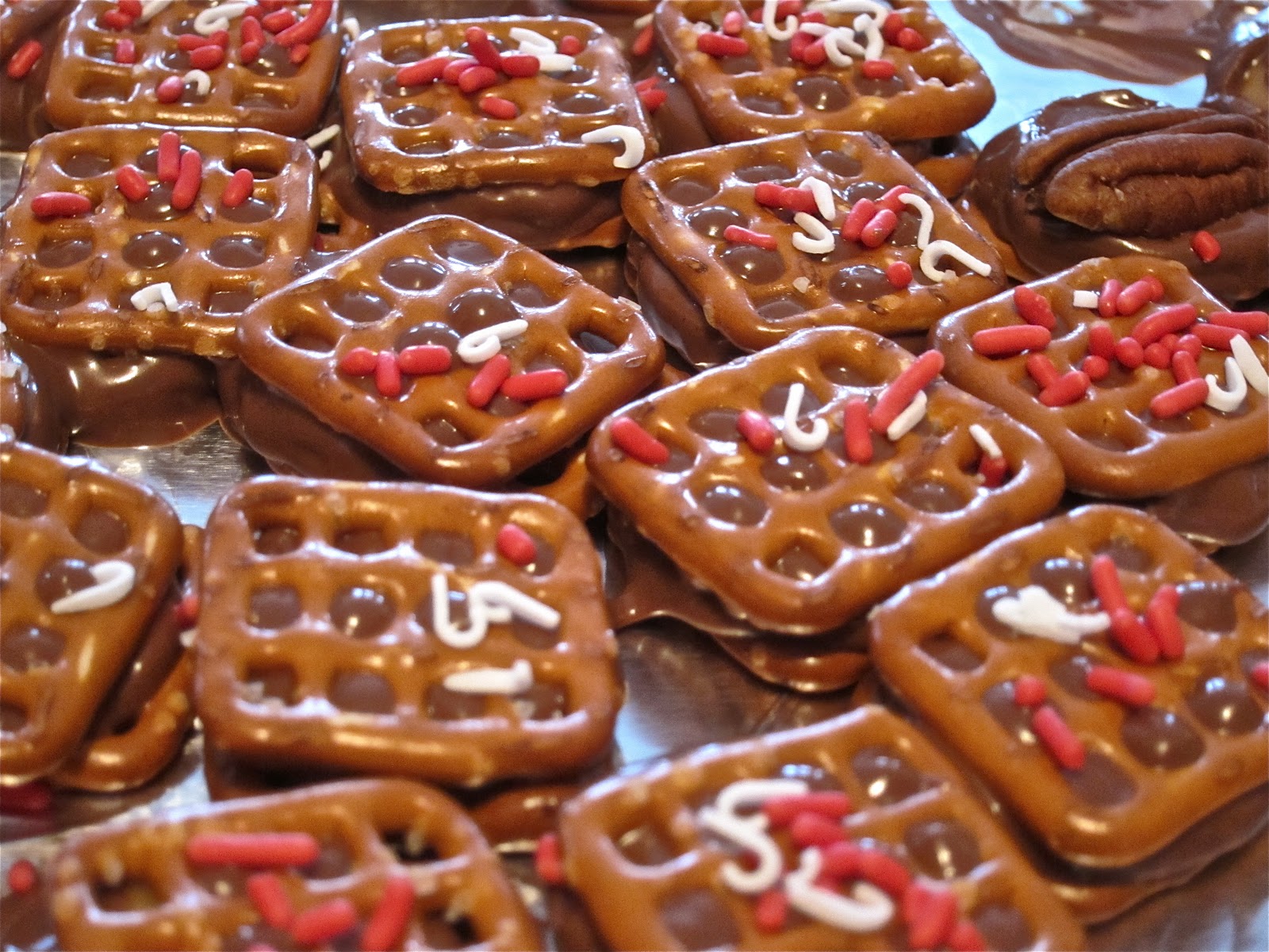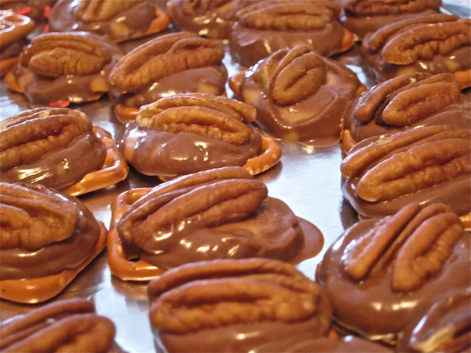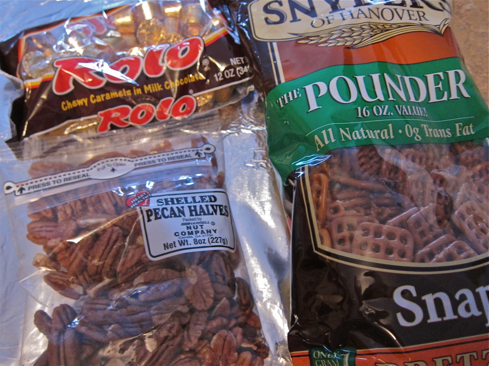 1 bag of Rolo candies, 1 bag of square pretzels, 1 small bag of pecan halves