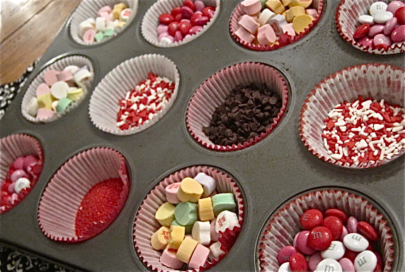 And a buffet of toppings! I simply placed Valentine’s M&Ms, heart sprinkles, red sprinkles, mini chocolate chips, and sweethearts in a muffin tin.
