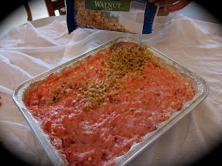 5 Ingredients. 1 box yellow cake mix, 1 21 oz can cherry pie filling, 1 15 oz can crushed pineapple, 8 oz chopped walnuts, 1/2 cup butter. I’m serious…that’s it